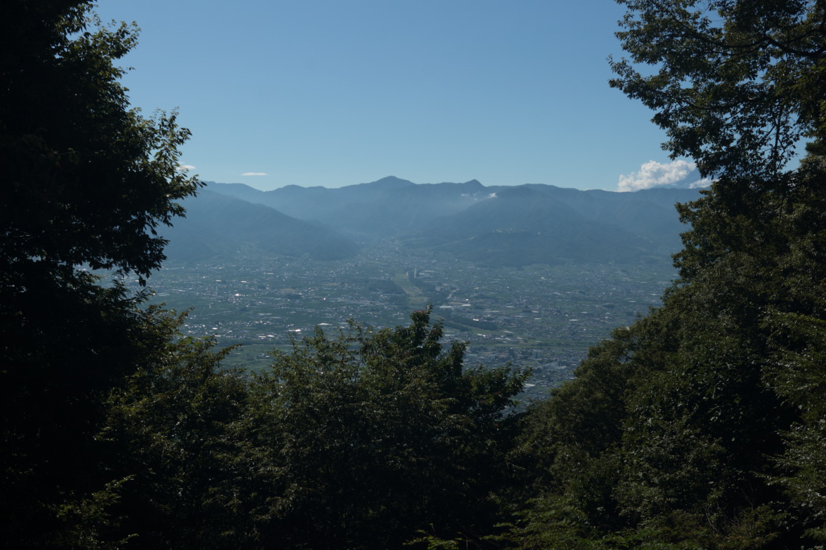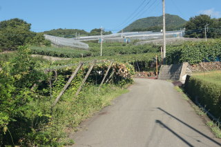 ブドウ畑や桃畑の斜面を登って行きます。 すれ違う人たちがみんな「おはようございます」と声をかけてきます。私も「おはようございます」と返します。 防犯目的なのだろうとは思いますが、気持ちが良いです。 Canon EOS Kiss X7 EF-S24mm f/2.8 STM 24mm(38mm) ISO 100 F7.1 1/200s |