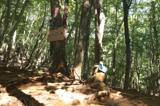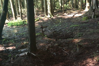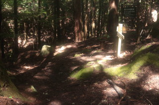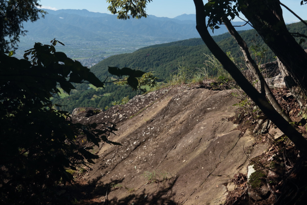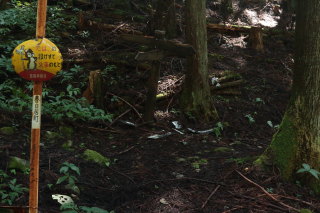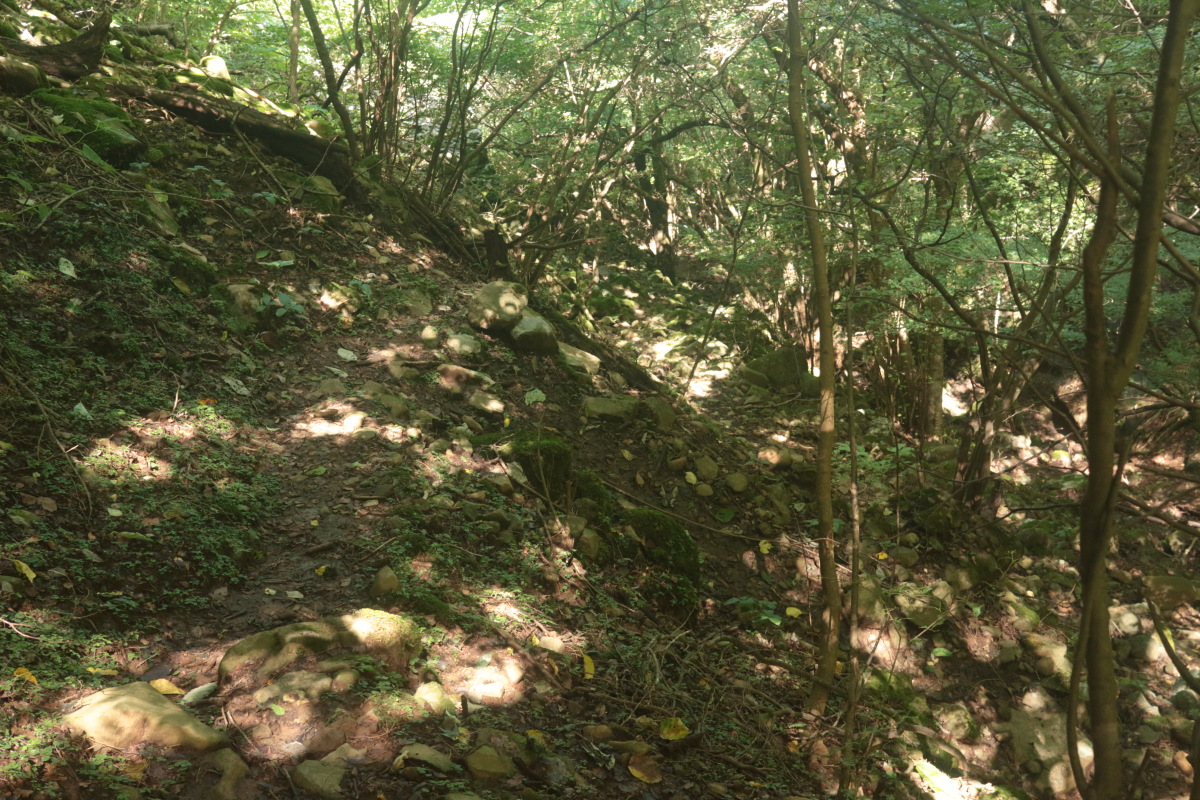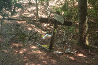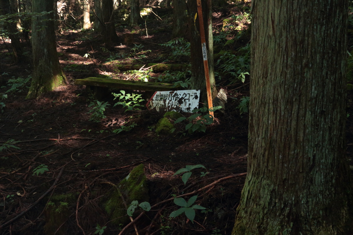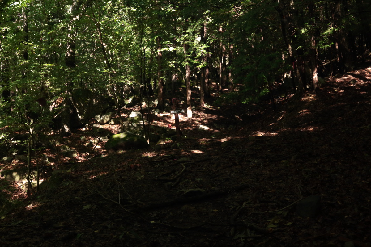 ここから上り返しになるのですが、登山道が川状になっているので、深みにはまらないよう注意して歩きました。 近くには年代を感じるような道標跡がありました。 Canon EOS Kiss X7 EF-S24mm f/2.8 STM 24mm(38mm) ISO 250 F5.6 1/80s |