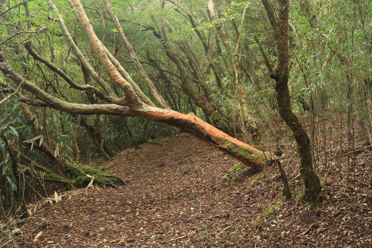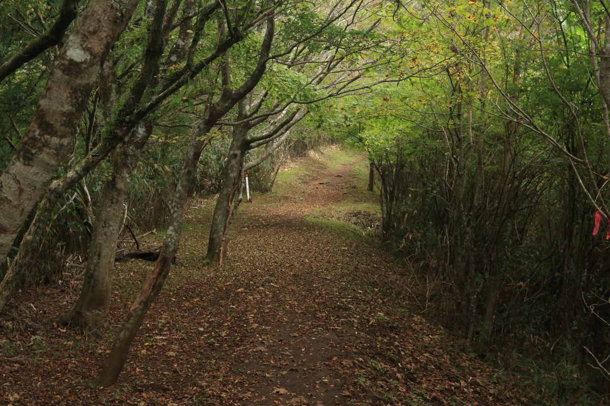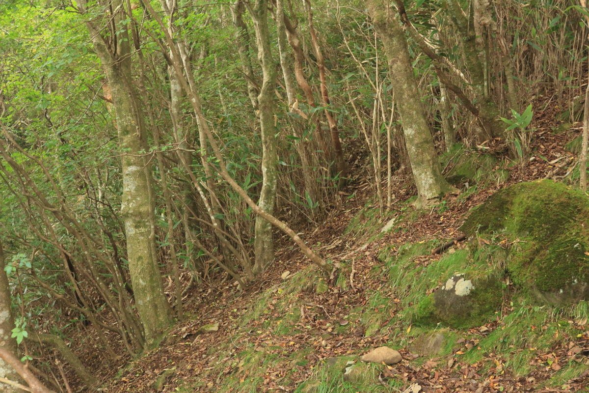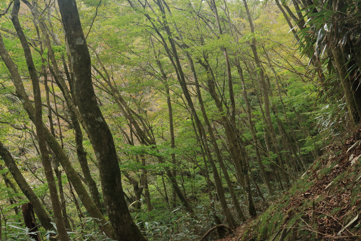 このあたりで笹林が終わり、普通の広葉樹林になります。 Canon EOS Kiss X7 EF-S24mm f/2.8 STM 24mm(38mm) ISO 1250 F5.6 1/80s |