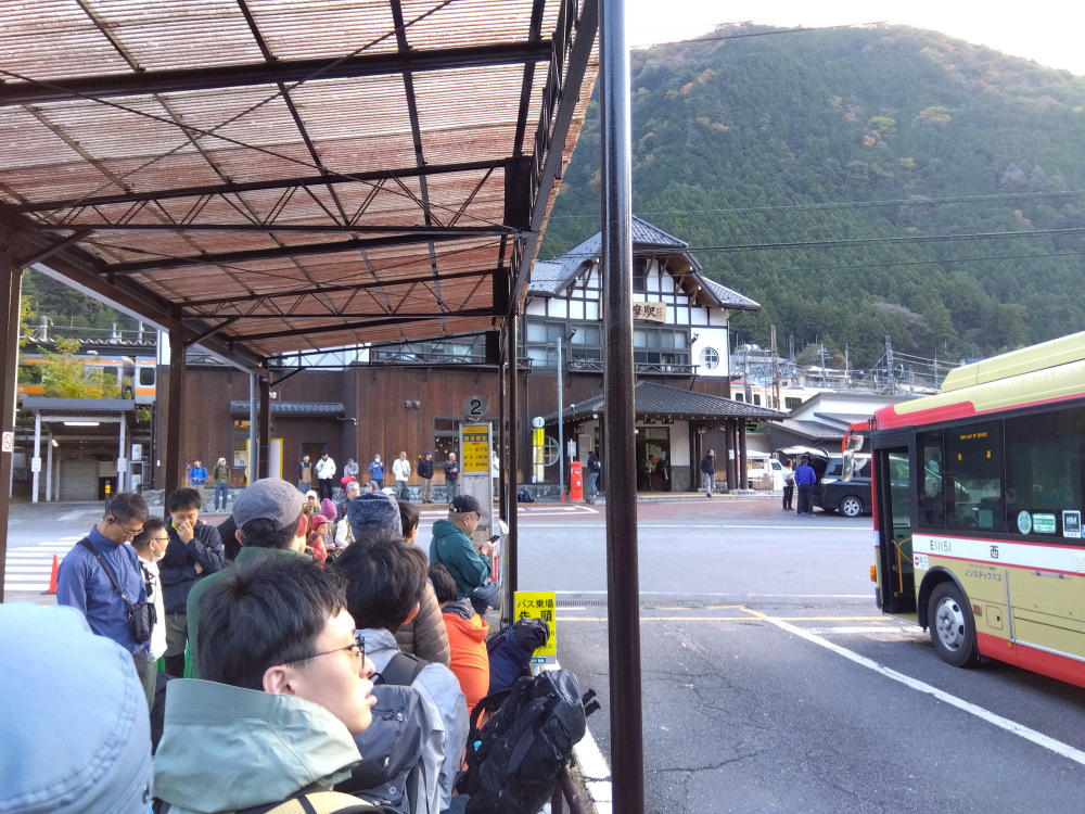 定刻(7:17)通り奥多摩駅到着。バス停には大勢並びました(40人ぐらい?)。 でも今日は臨時便は出なかったので、バス内はめちゃくちゃ混みました。 SH-M20 3.6mm(26mm) ISO 120 F2.0 1/60s |