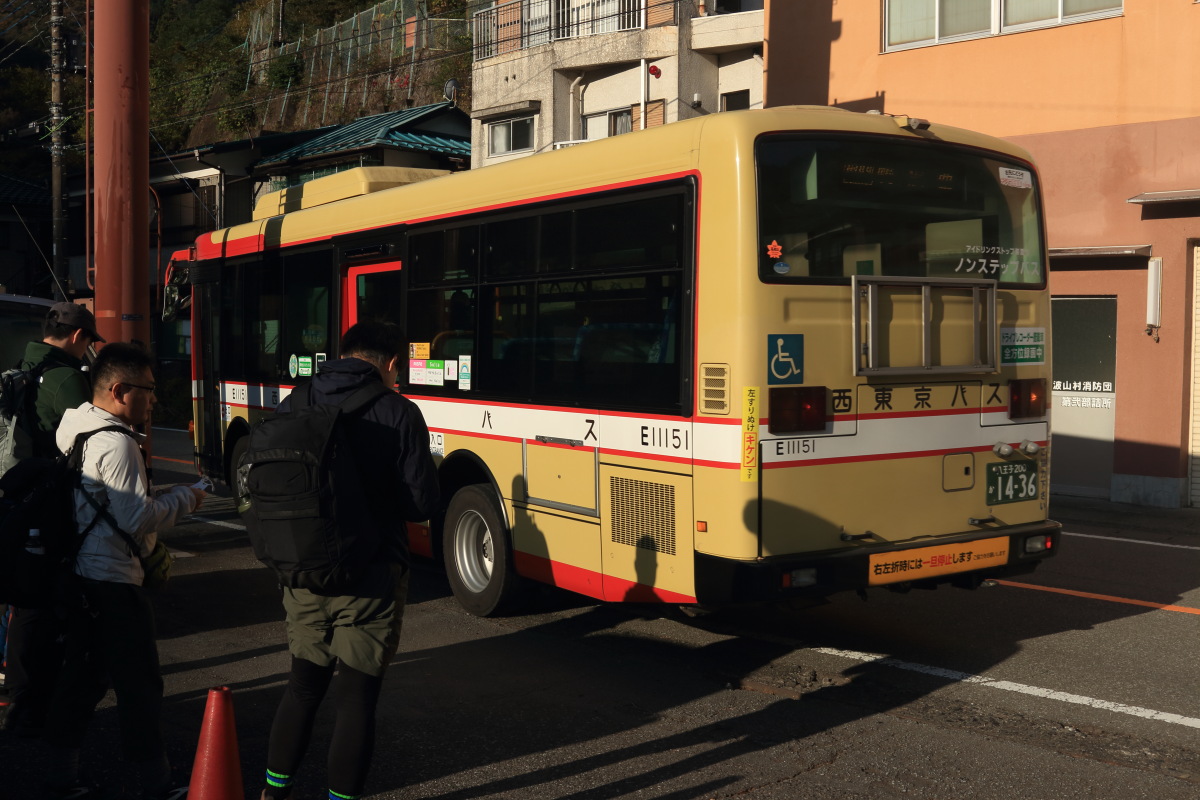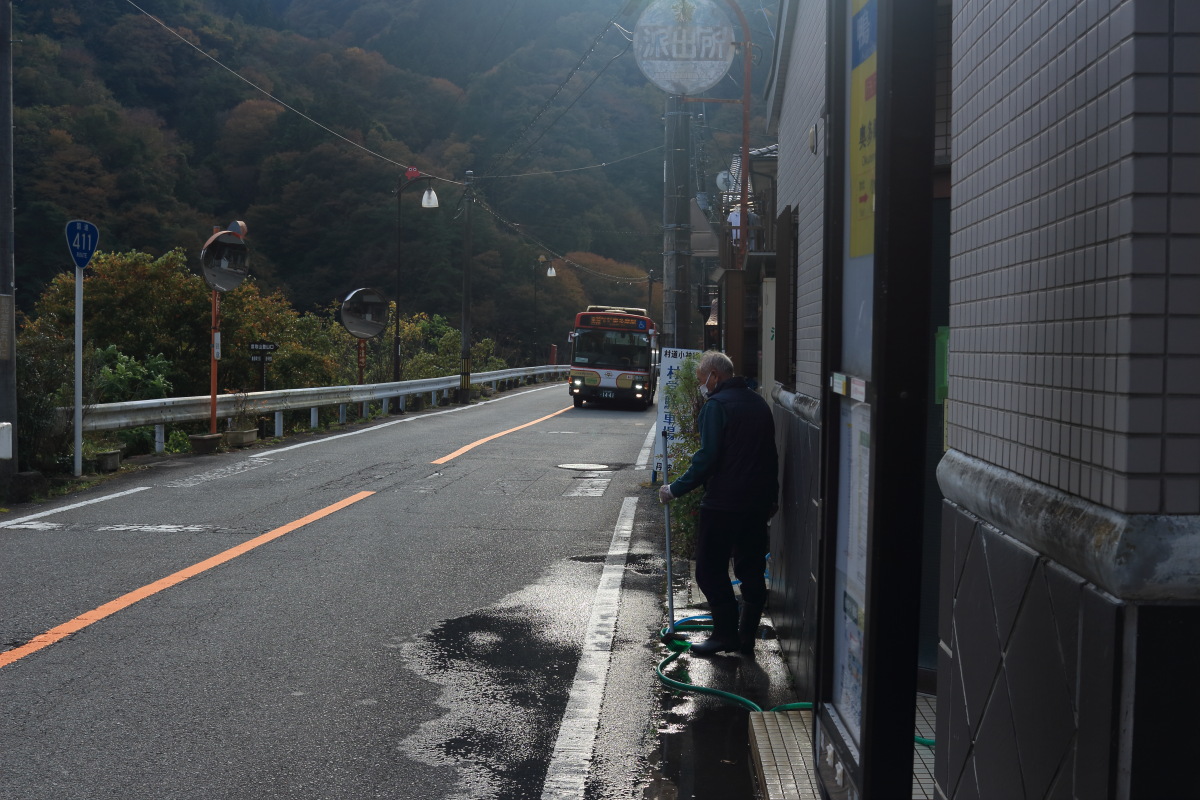 途中で乗車する乗客はいなかったものの、水根や奥多摩湖のバス停などで降車に時間がかかり、5分ほど遅れて鴨沢バス停に到着(8:03)。 Canon EOS Kiss X7 EF-S24mm f/2.8 STM 24mm(38mm) ISO 100 F9.0 1/320s |