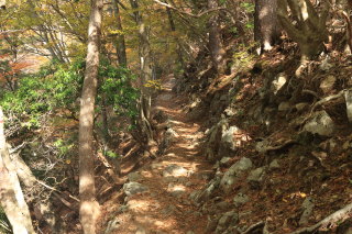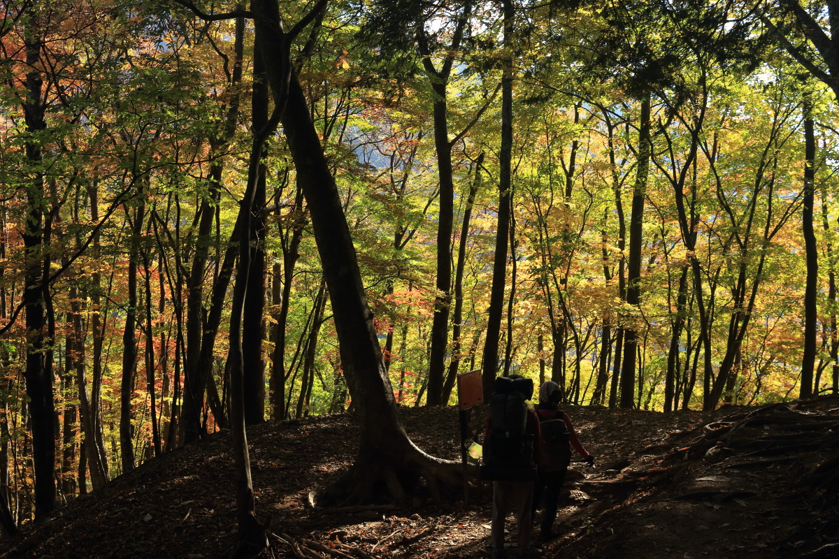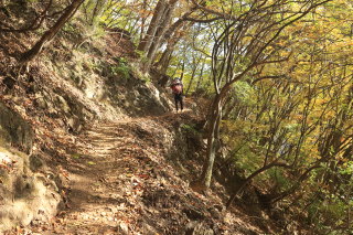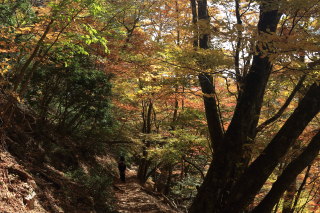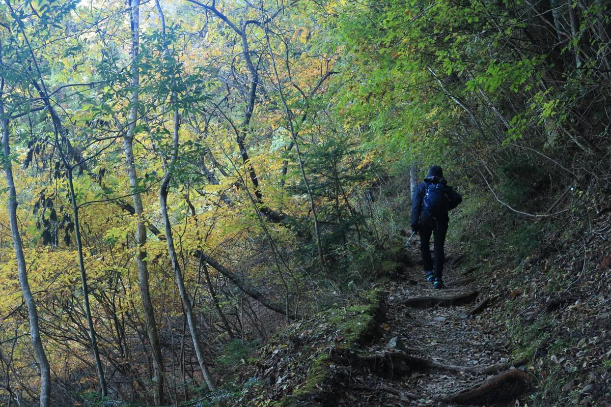 登山道に入ります。まだ標高は低い(600m)ぐらいですが、すでに紅葉が始まっています。 Canon EOS Kiss X7 EF-S24mm f/2.8 STM 24mm(38mm) ISO 1600 F5.6 1/80s |