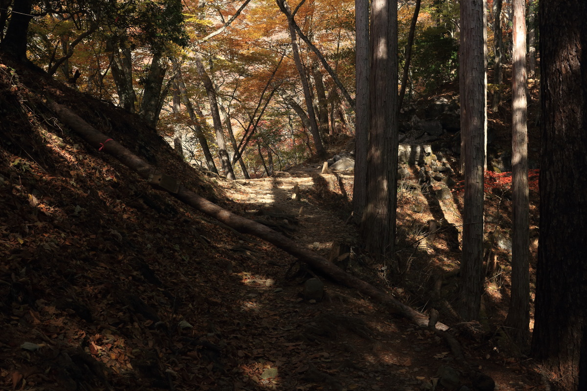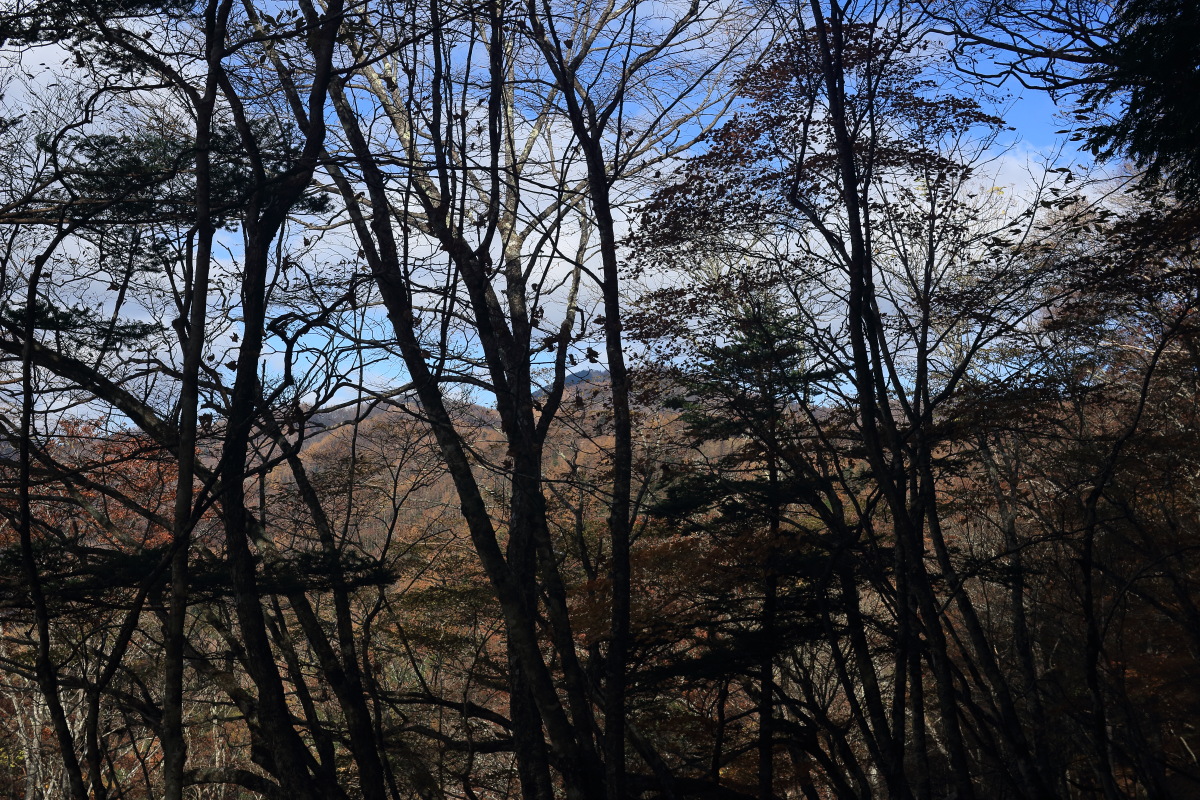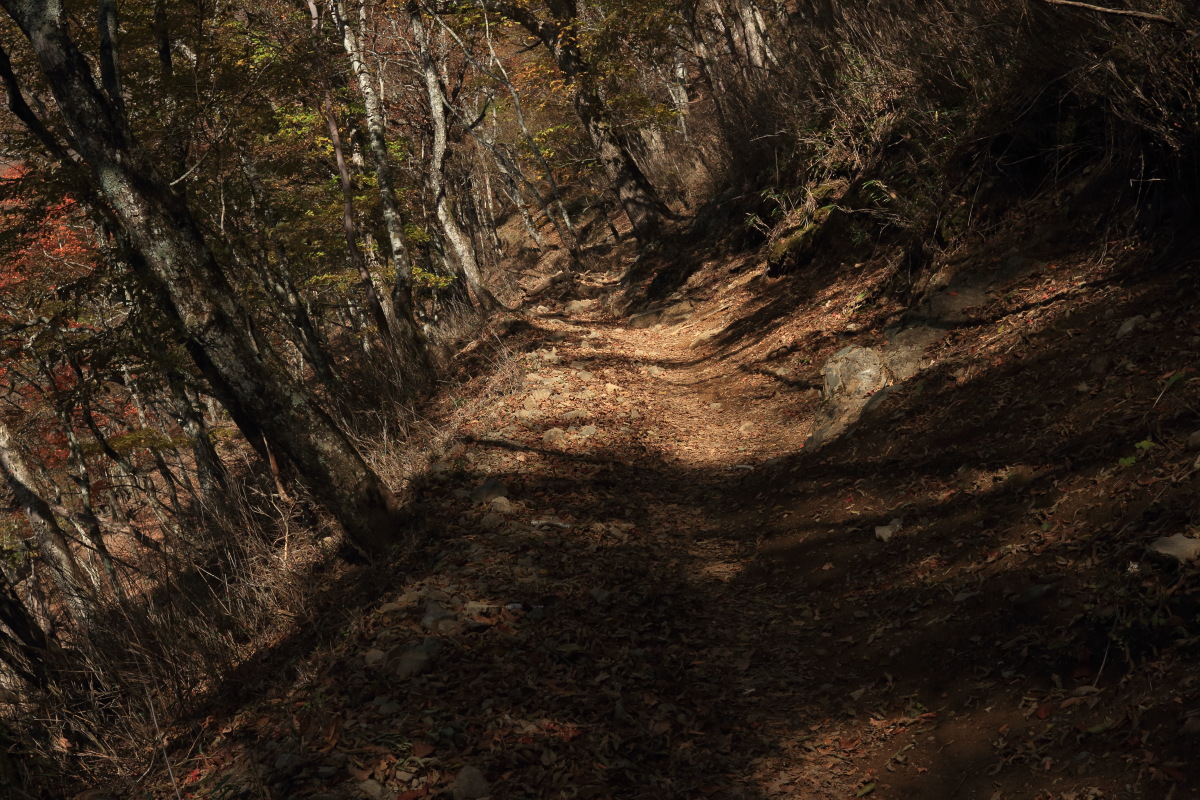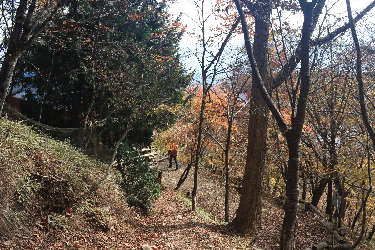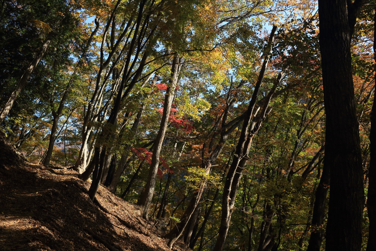 急こう配の道をどんどん登ります。 ここまで来ると、紅葉はほぼ終わっています。 Canon EOS Kiss X7 EF-S24mm f/2.8 STM 24mm(38mm) ISO 100 F7.1 1/200s |