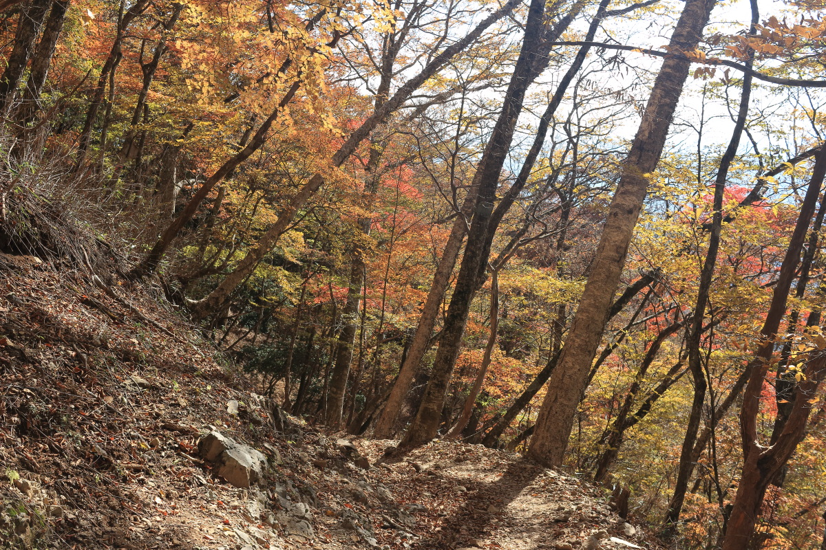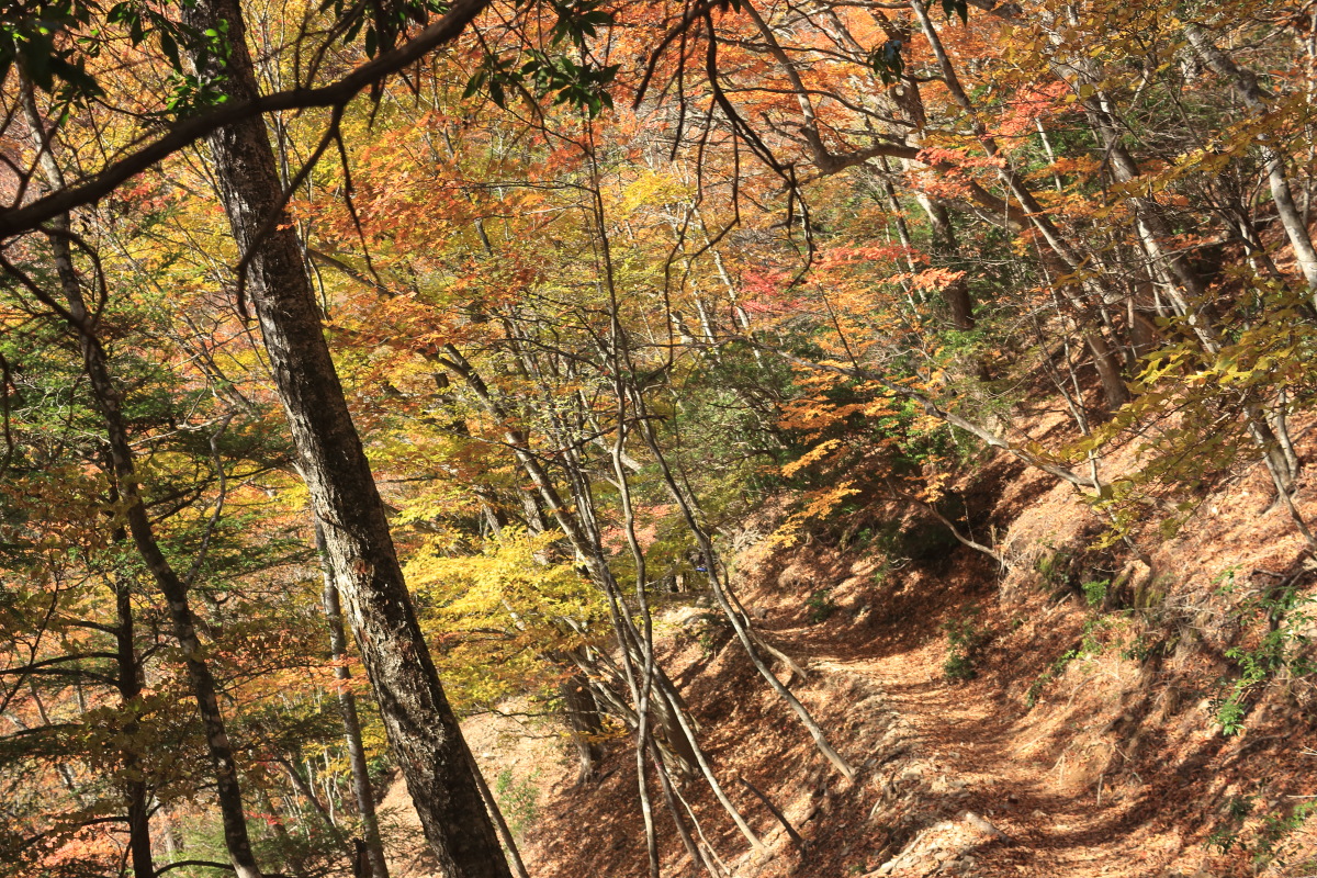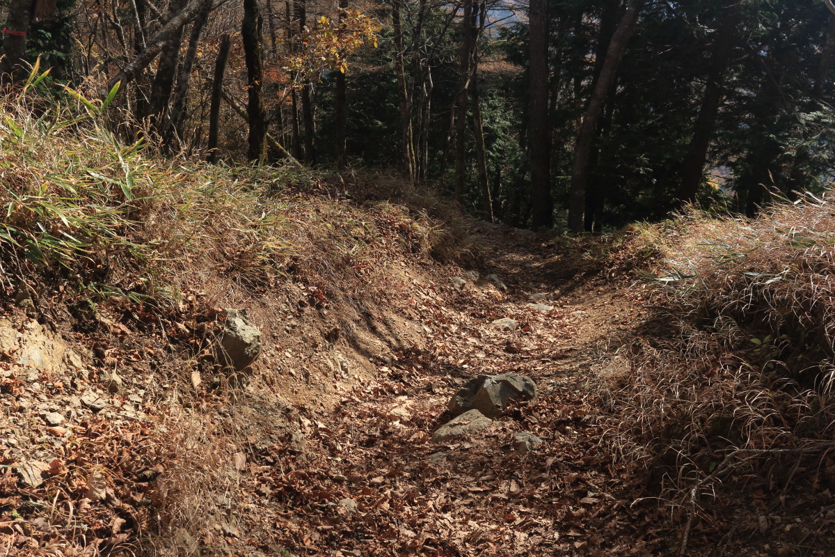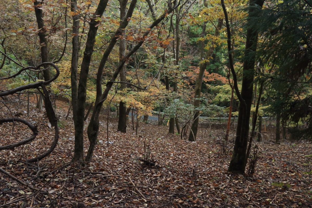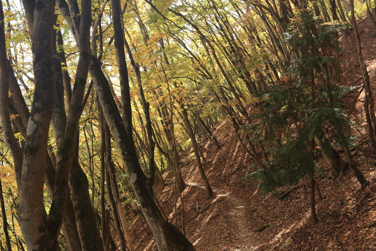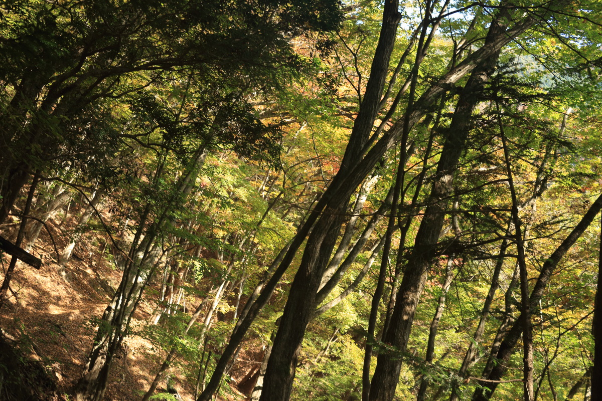 急こう配の道をどんどん登ります。 ここまで来ると、紅葉はほぼ終わっています。 Canon EOS Kiss X7 EF-S24mm f/2.8 STM 24mm(38mm) ISO 100 F7.1 1/200s |