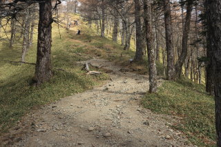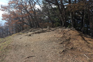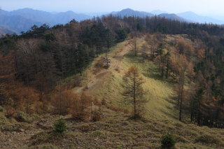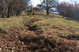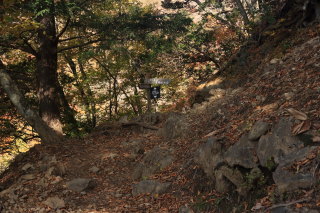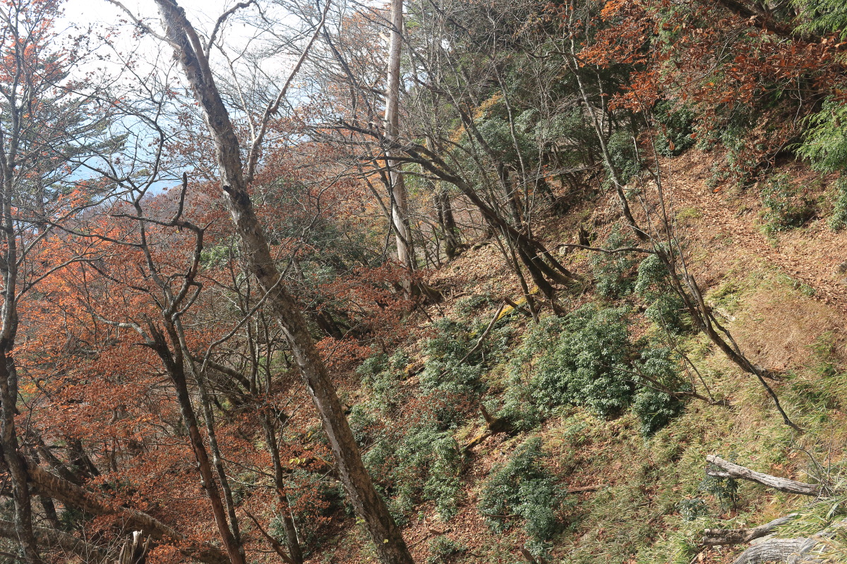 尾根歩きは終了。ここから斜面下りになります(12:45)。 Canon EOS Kiss X7 EF-S24mm f/2.8 STM 24mm(38mm) ISO 1250 F5.6 1/80s |