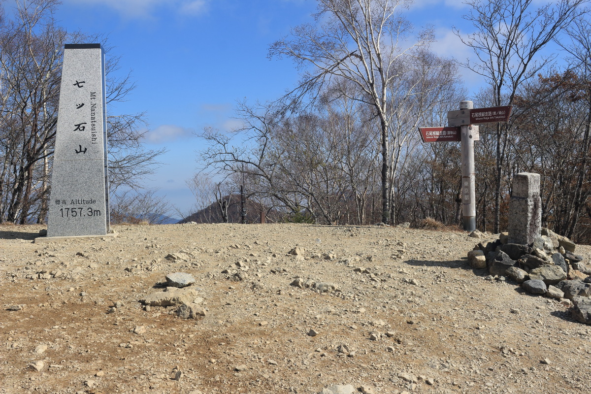 七ツ石山(1,757m)登頂(11:59)。山頂標はこちら。 ギリギリではありますが、午前中に登頂したのは初めてです。 Canon EOS Kiss X7 EF-S24mm f/2.8 STM 24mm(38mm) ISO 100 F10.0 1/400s |