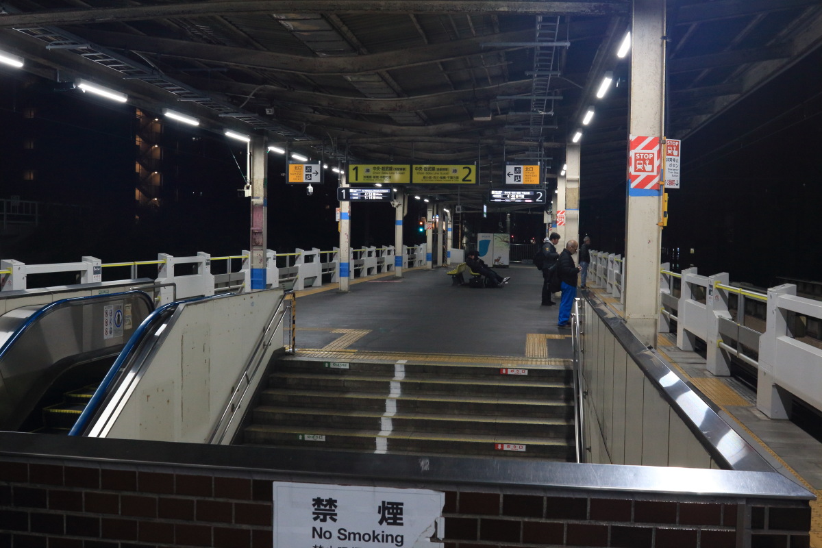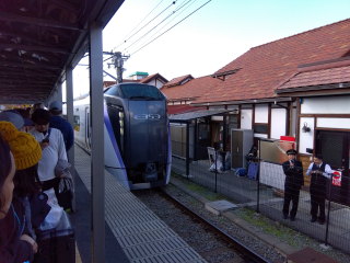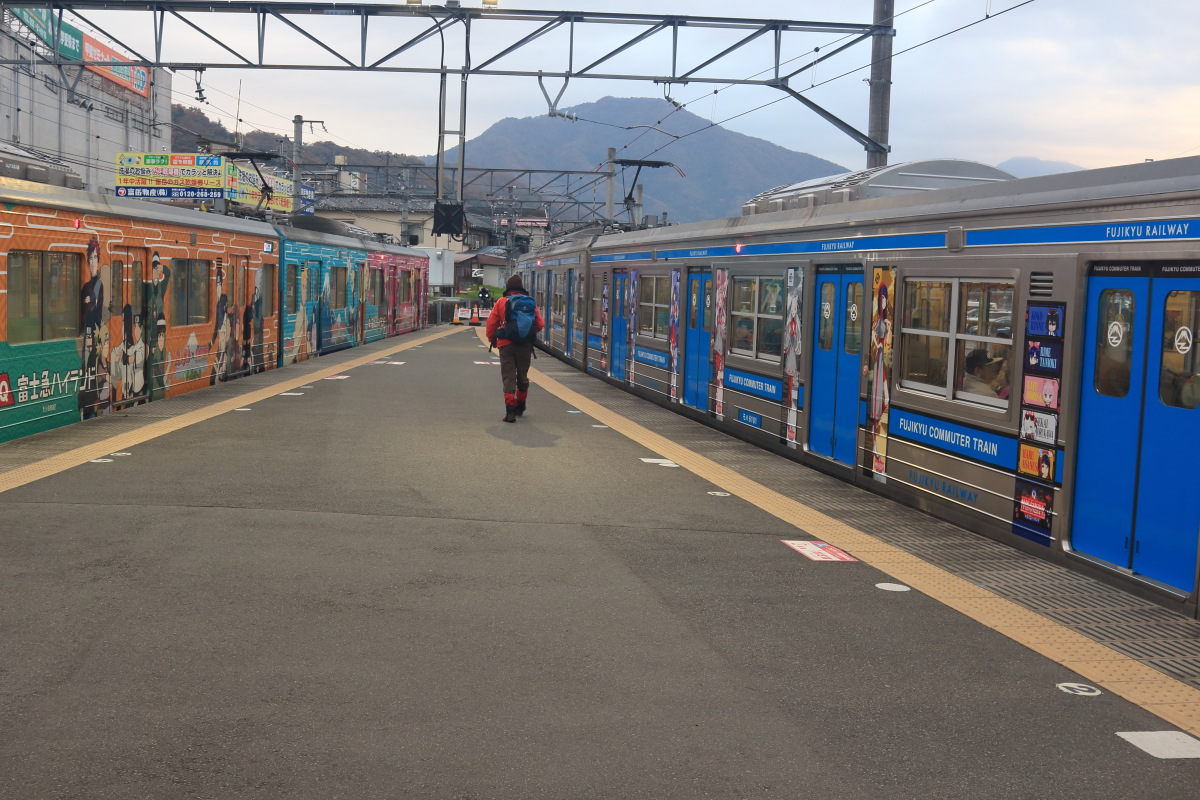 大月駅でトイレを済ませて、7:03 発の富士急行河口湖行きの電車に乗り換えました(左写真 6:54)。 Canon EOS Kiss X7 EF-S24mm f/2.8 STM 24mm(38mm) ISO 400 F5.6 1/80s |