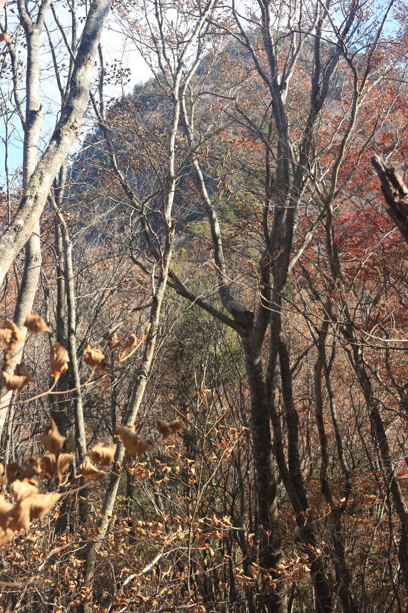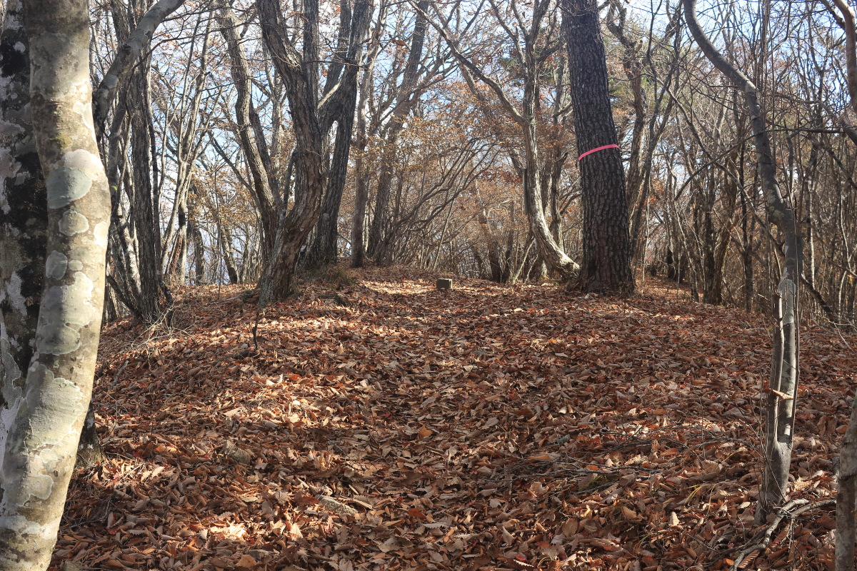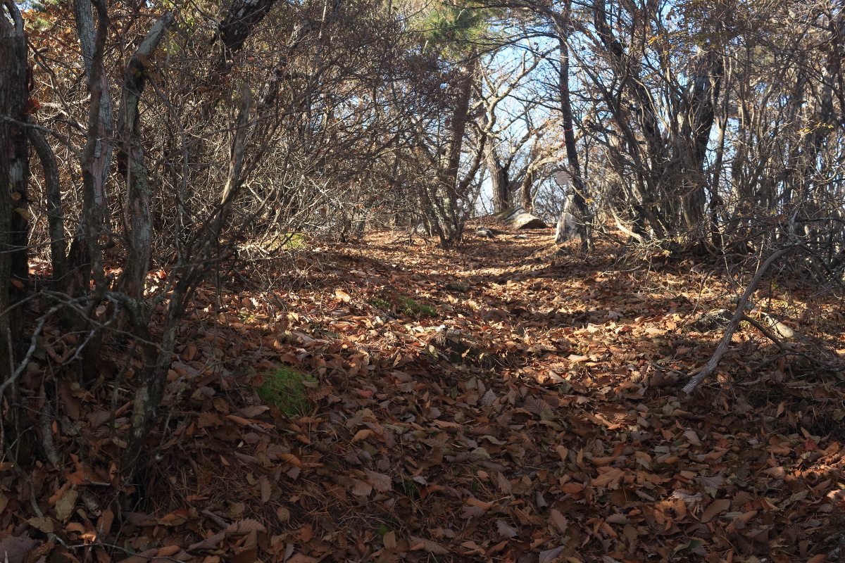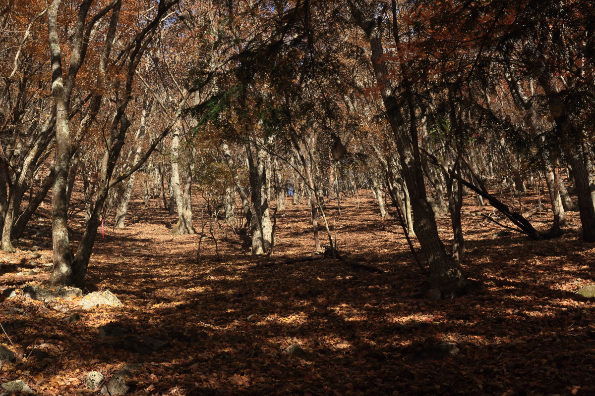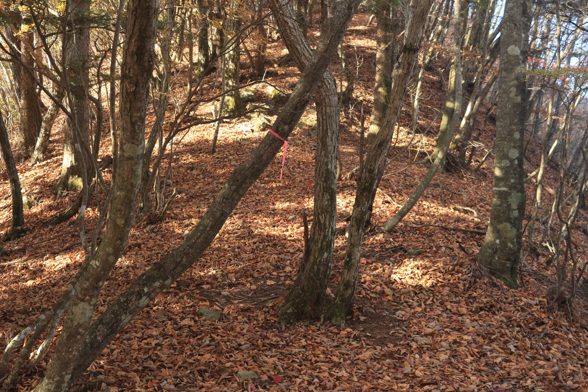 枯葉でぼやぁっとした登山道を登って行きます。 高密度にピンクテープがあるので、道に迷うことはありませんでした。 Canon EOS Kiss X7 EF-S24mm f/2.8 STM 24mm(38mm) ISO 100 F4.0 1/60s |