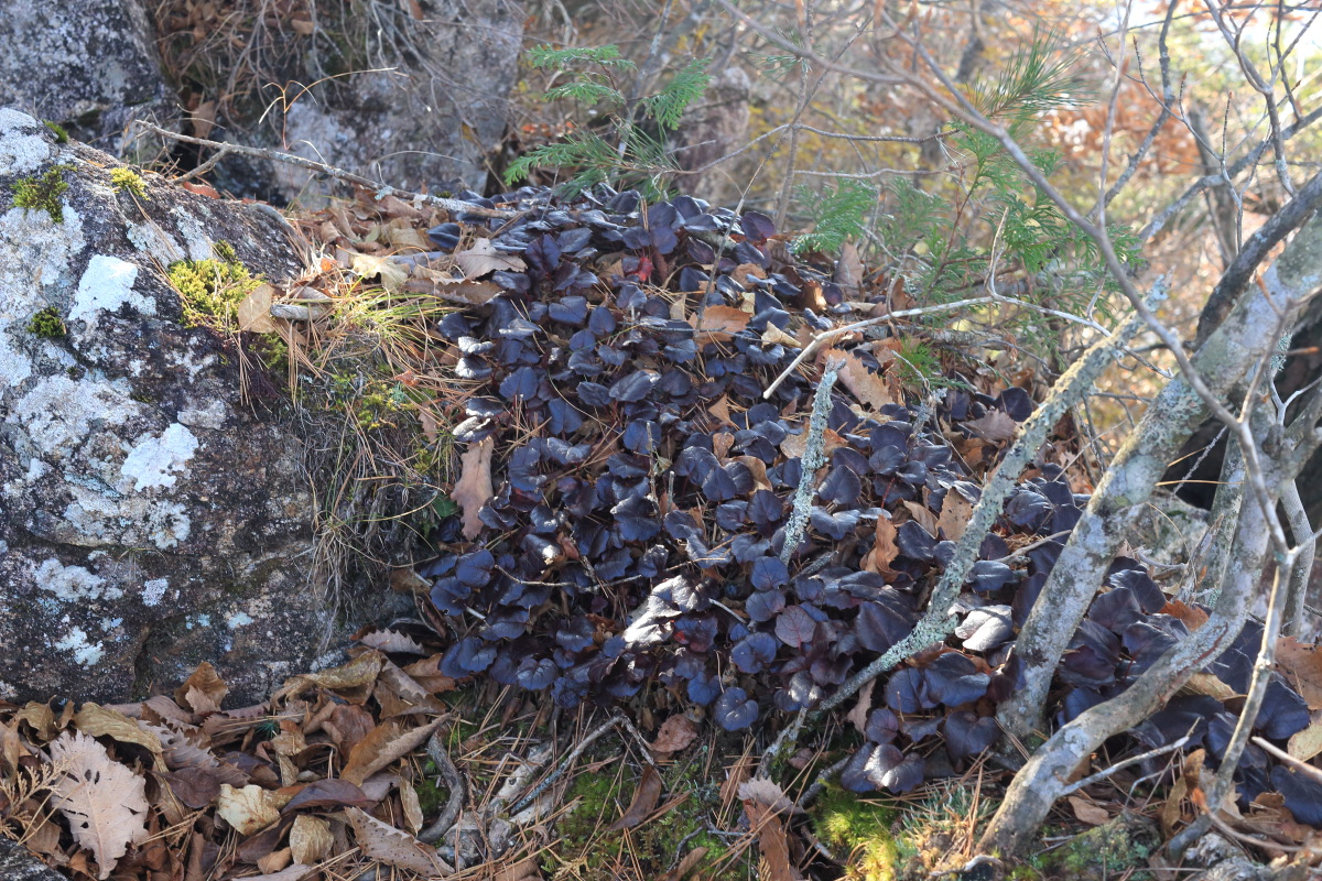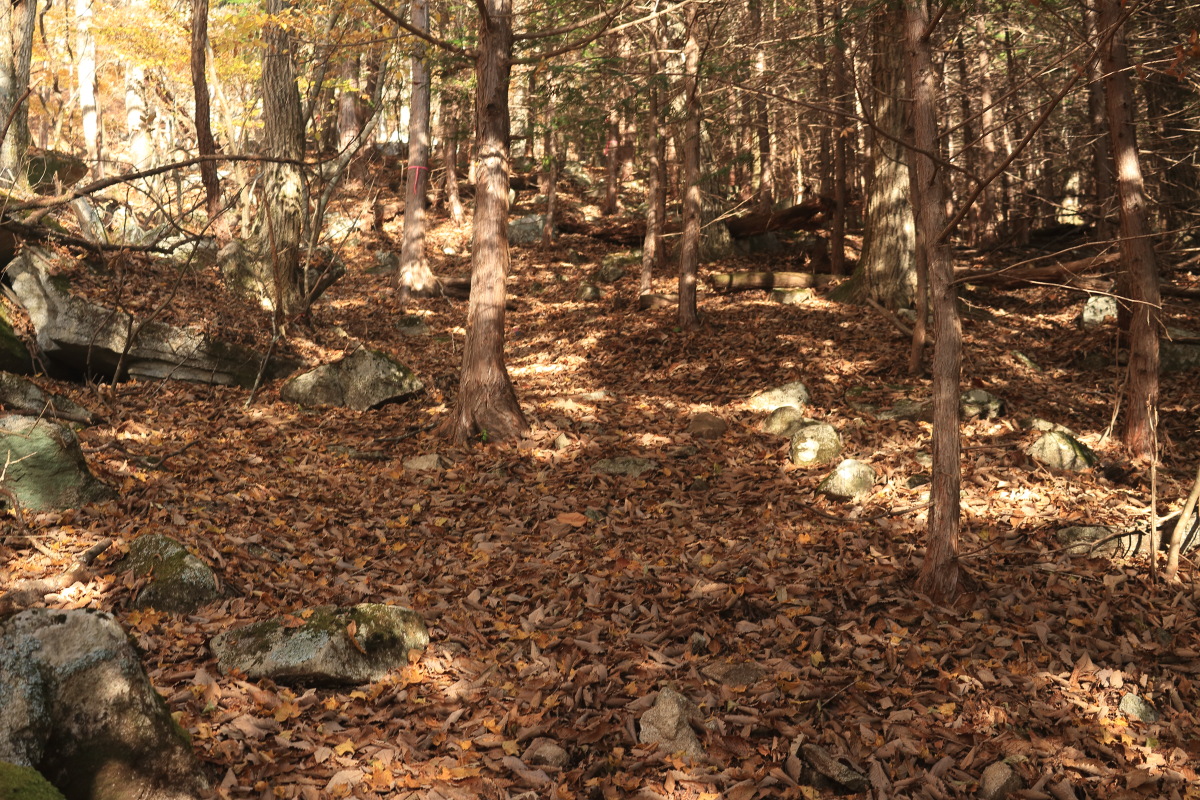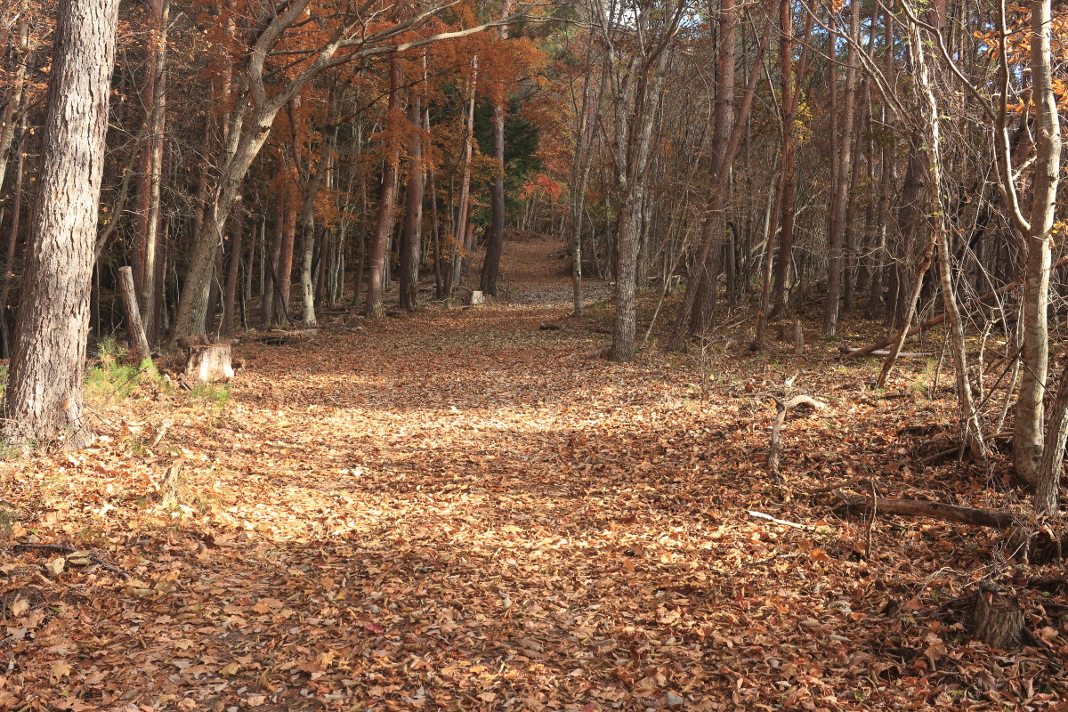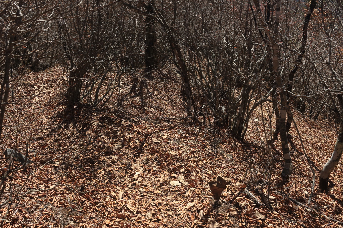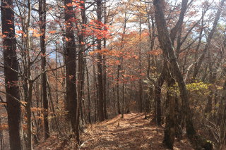 枯葉でぼやぁっとした登山道を登って行きます。 高密度にピンクテープがあるので、道に迷うことはありませんでした。 Canon EOS Kiss X7 EF-S24mm f/2.8 STM 24mm(38mm) ISO 100 F4.0 1/60s |