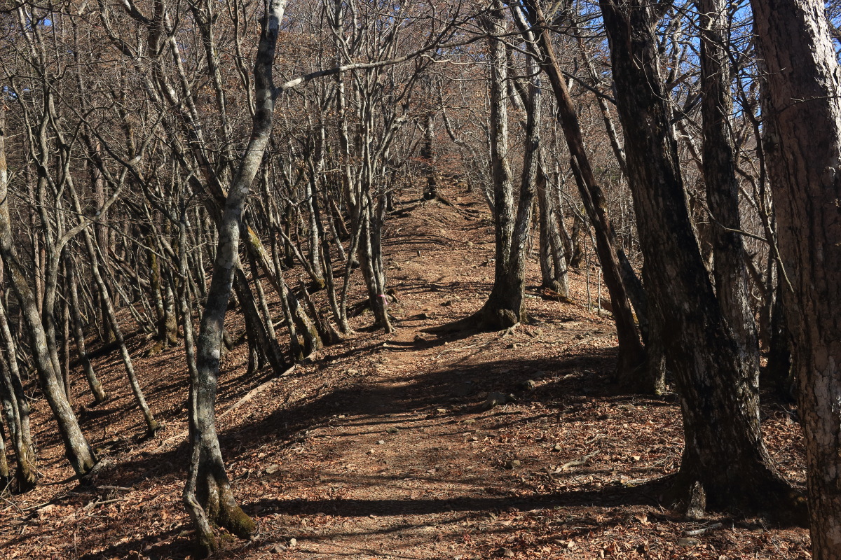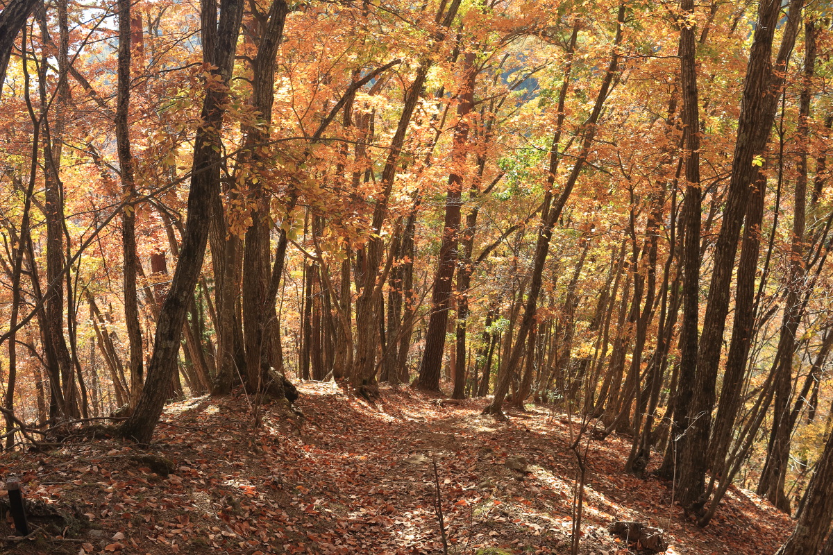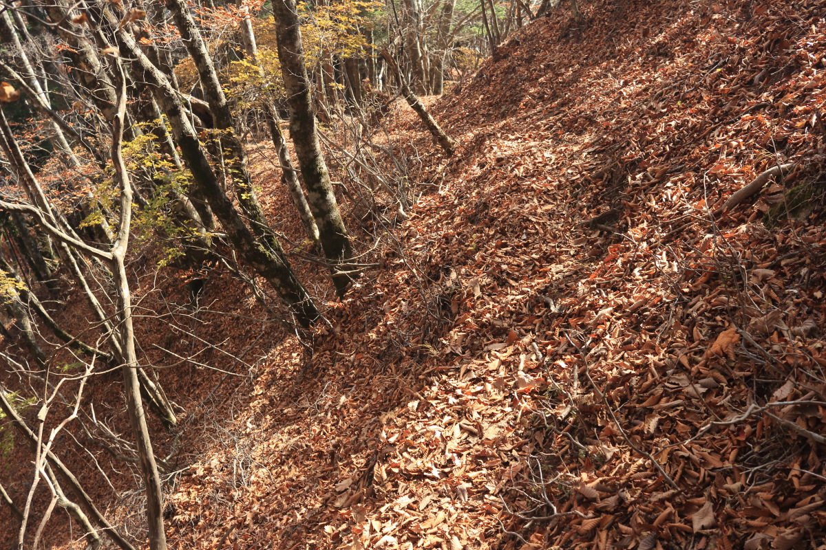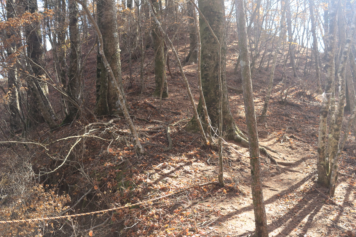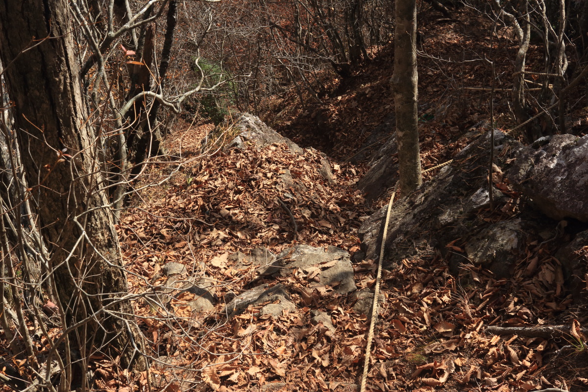 中沢山を過ぎると一層急斜面になります。 枯葉が降り積もったロープの道は、よく滑るし浮石や木の根も気づきにくいので危険。 Canon EOS Kiss X7 EF-S24mm f/2.8 STM 24mm(38mm) ISO 100 F10.0 1/100s |
