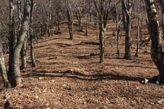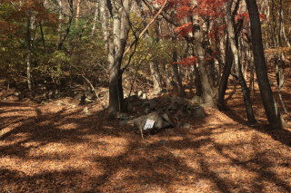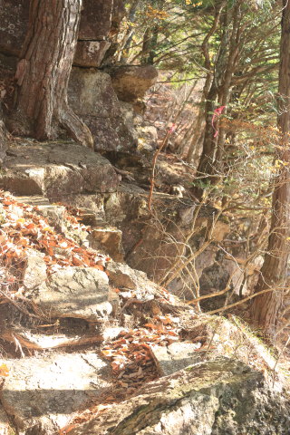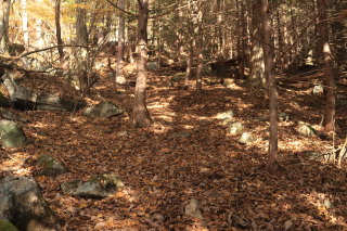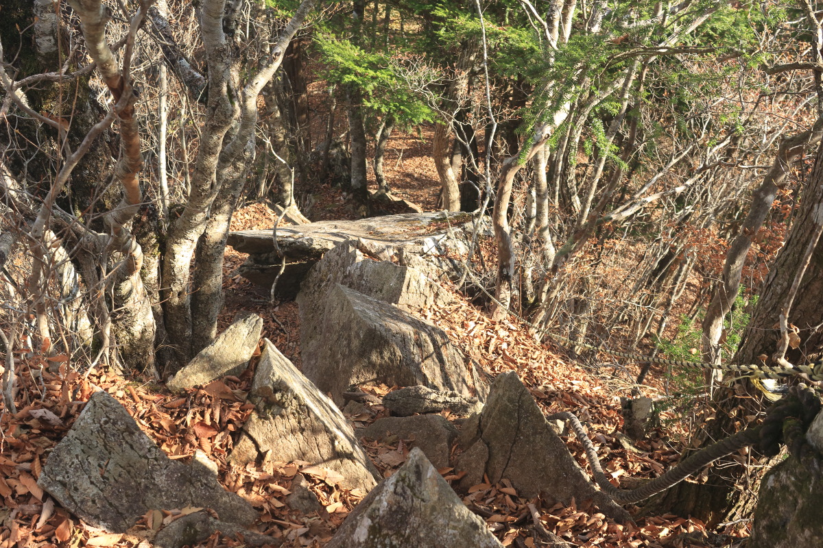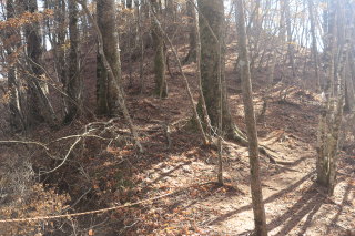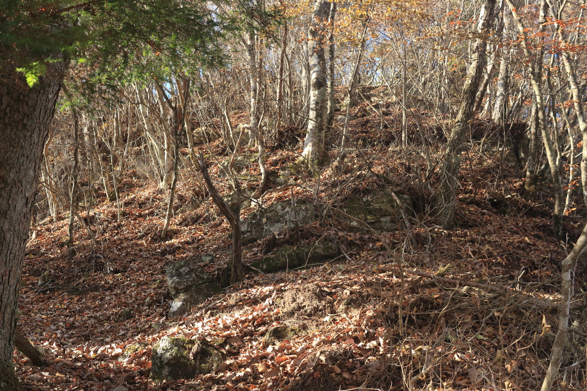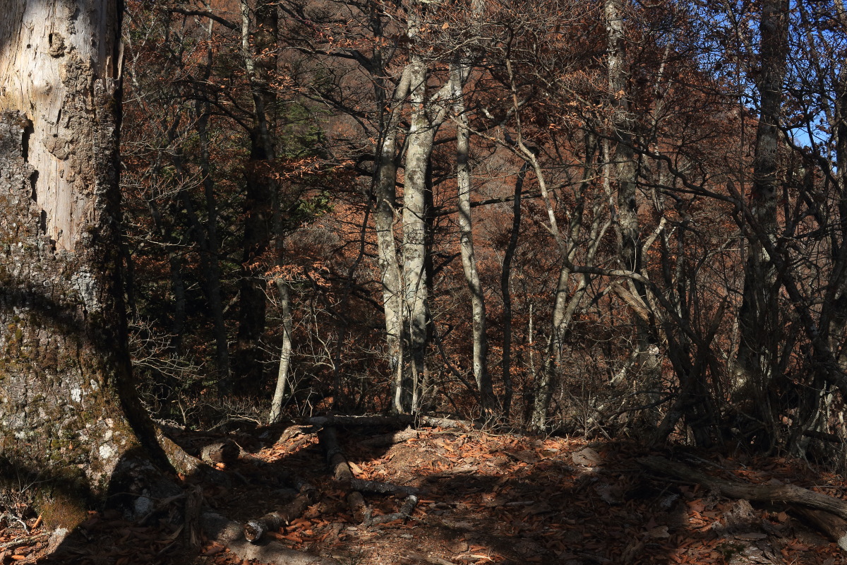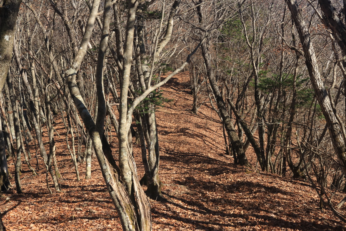中沢山を過ぎると一層急斜面になります。 枯葉が降り積もったロープの道は、よく滑るし浮石や木の根も気づきにくいので危険。 Canon EOS Kiss X7 EF-S24mm f/2.8 STM 24mm(38mm) ISO 100 F10.0 1/100s |
