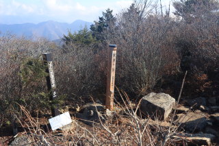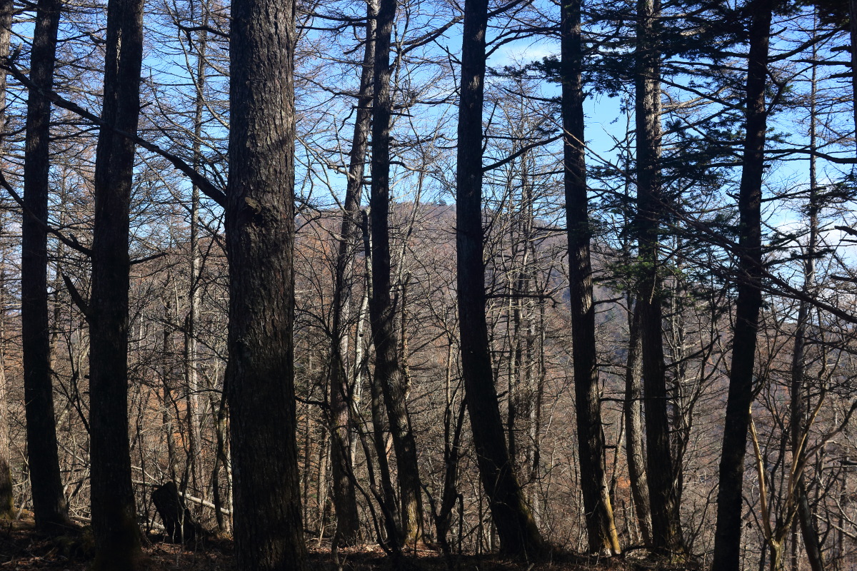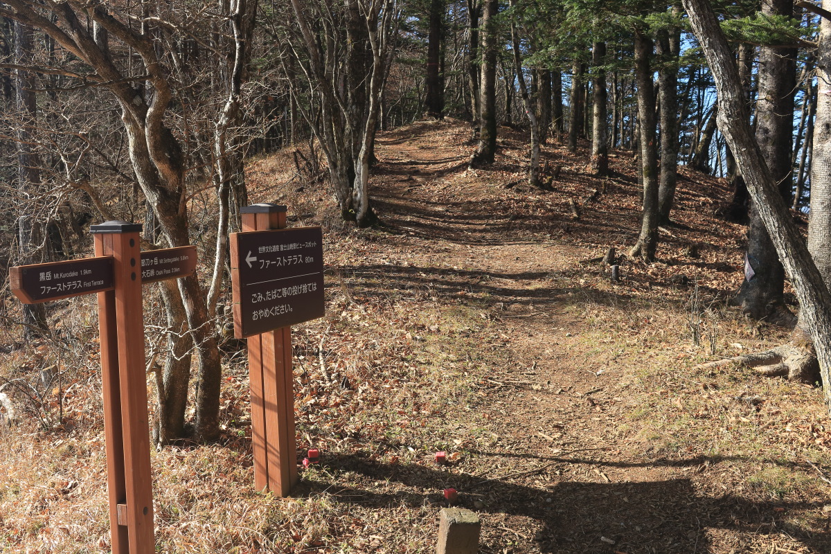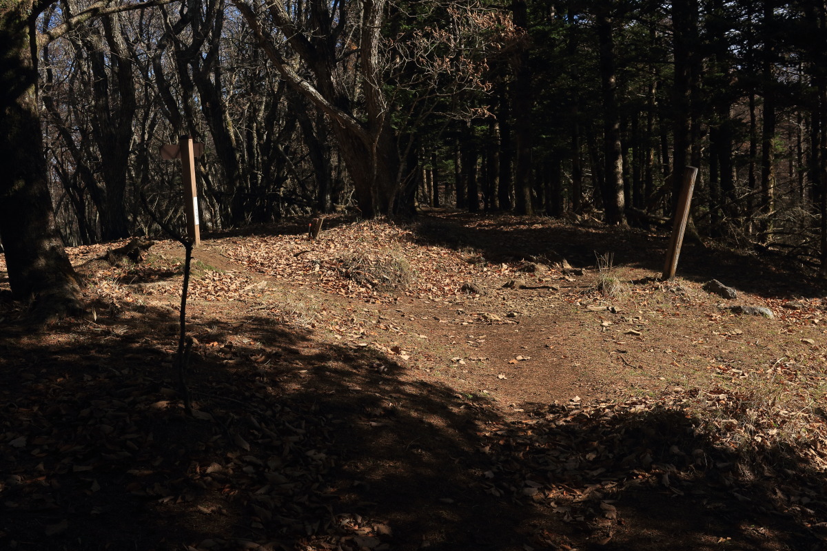 尾根に出ました(8:59)。標高は 1,487m です。 道標の近接写真はこちら。 Canon EOS Kiss X7 EF-S24mm f/2.8 STM 24mm(38mm) ISO 100 F7.1 1/200s |