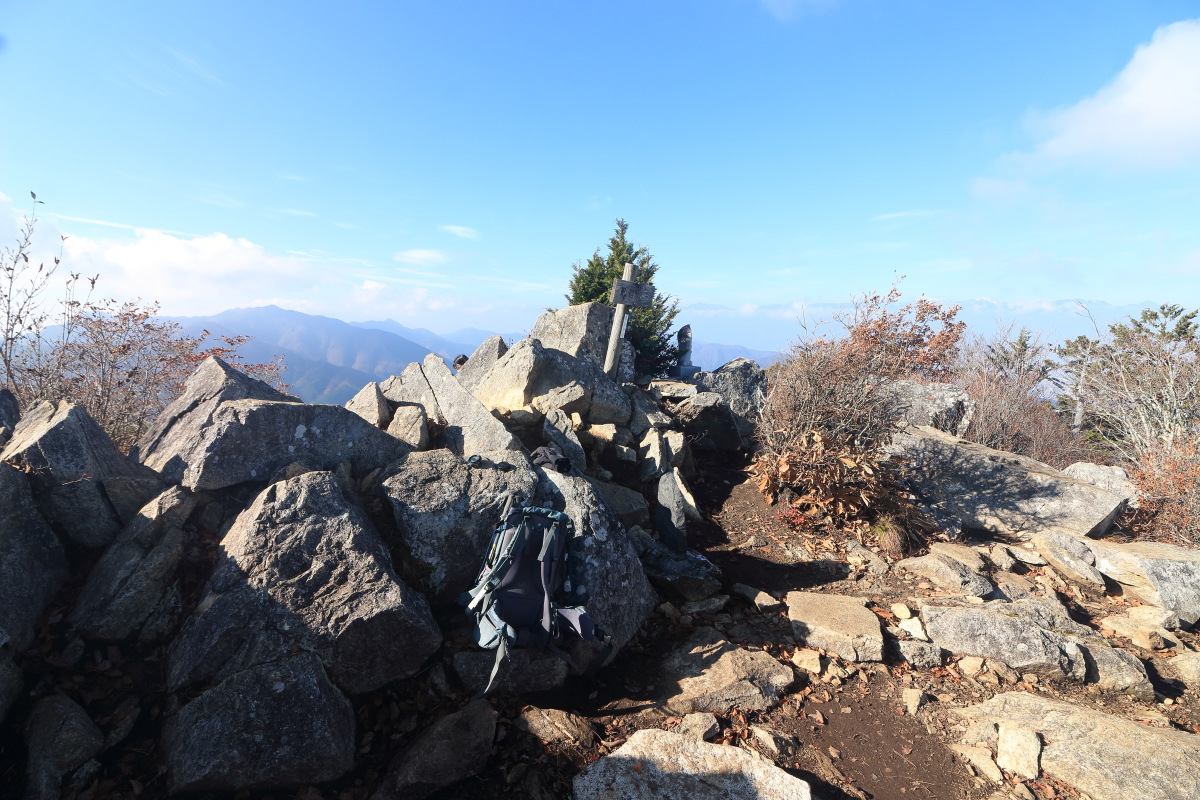 すぐに破風山(1,674m)到着(10:56)。 山頂標兼道標はこちら。 Canon EOS Kiss X7 EF-S24mm f/2.8 STM 24mm(38mm) ISO 100 F7.1 1/200s |