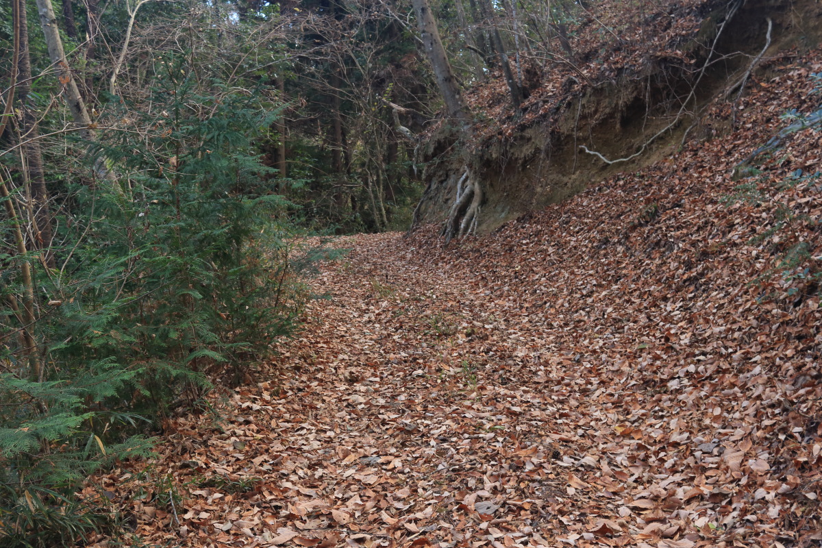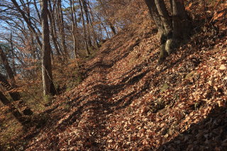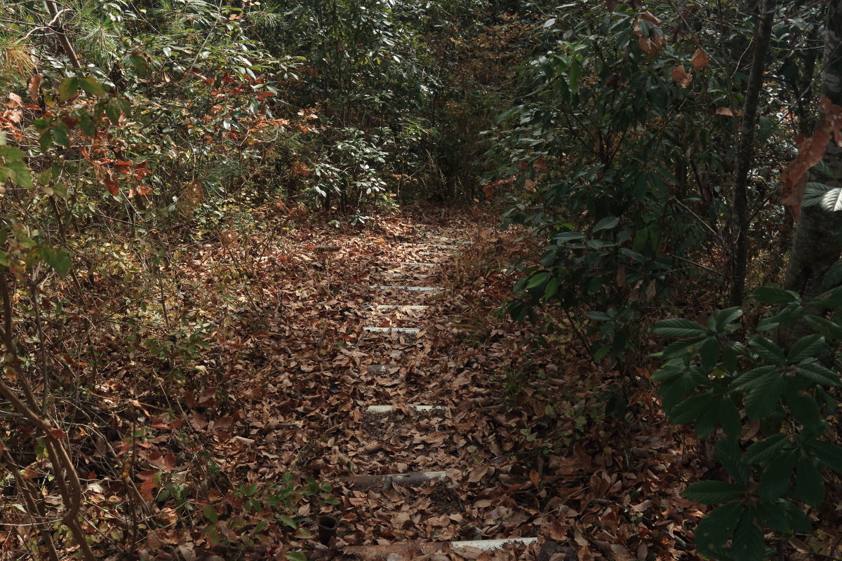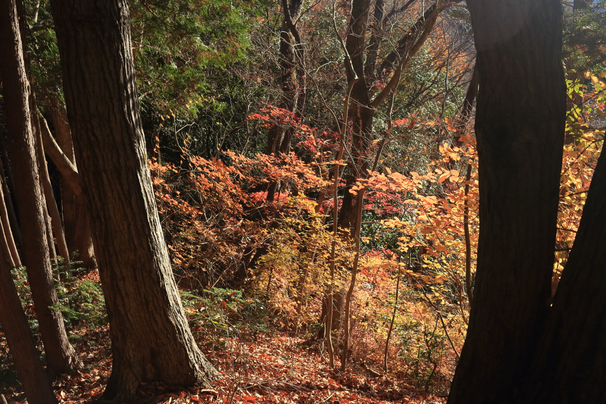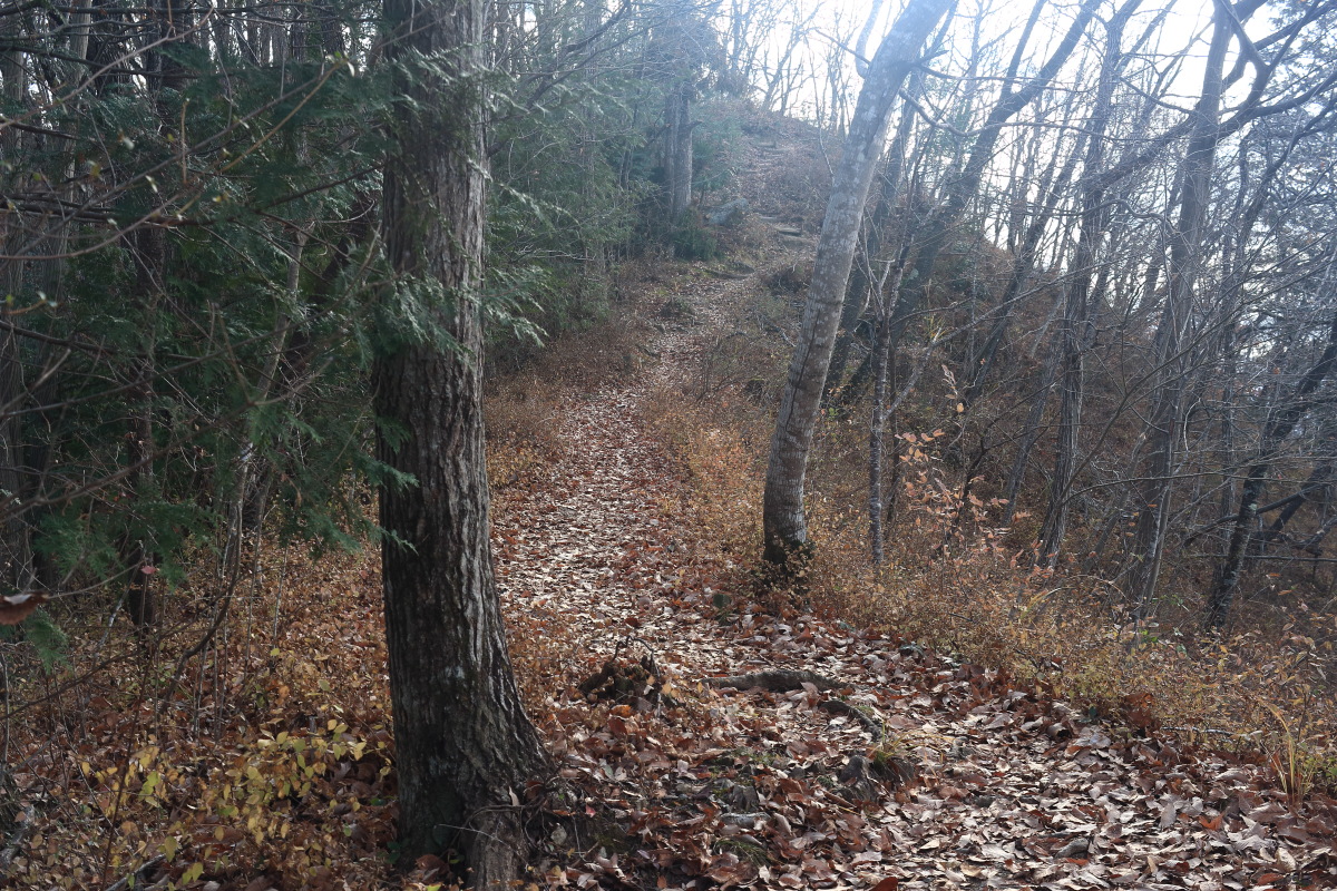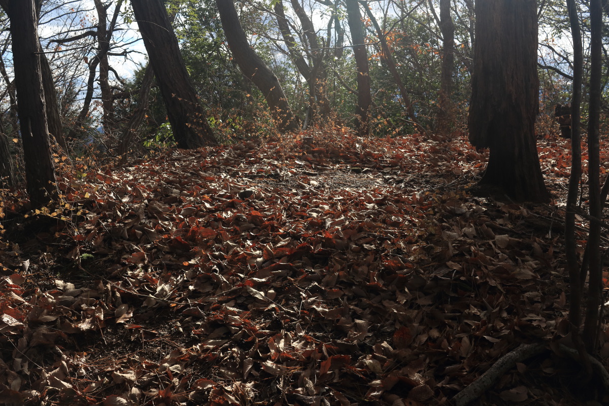 東側登山道も、急登。枯葉が降り積もっているので、よく滑ります。 Canon EOS Kiss X7 EF-S24mm f/2.8 STM 24mm(38mm) ISO 160 F5.6 1/80s |