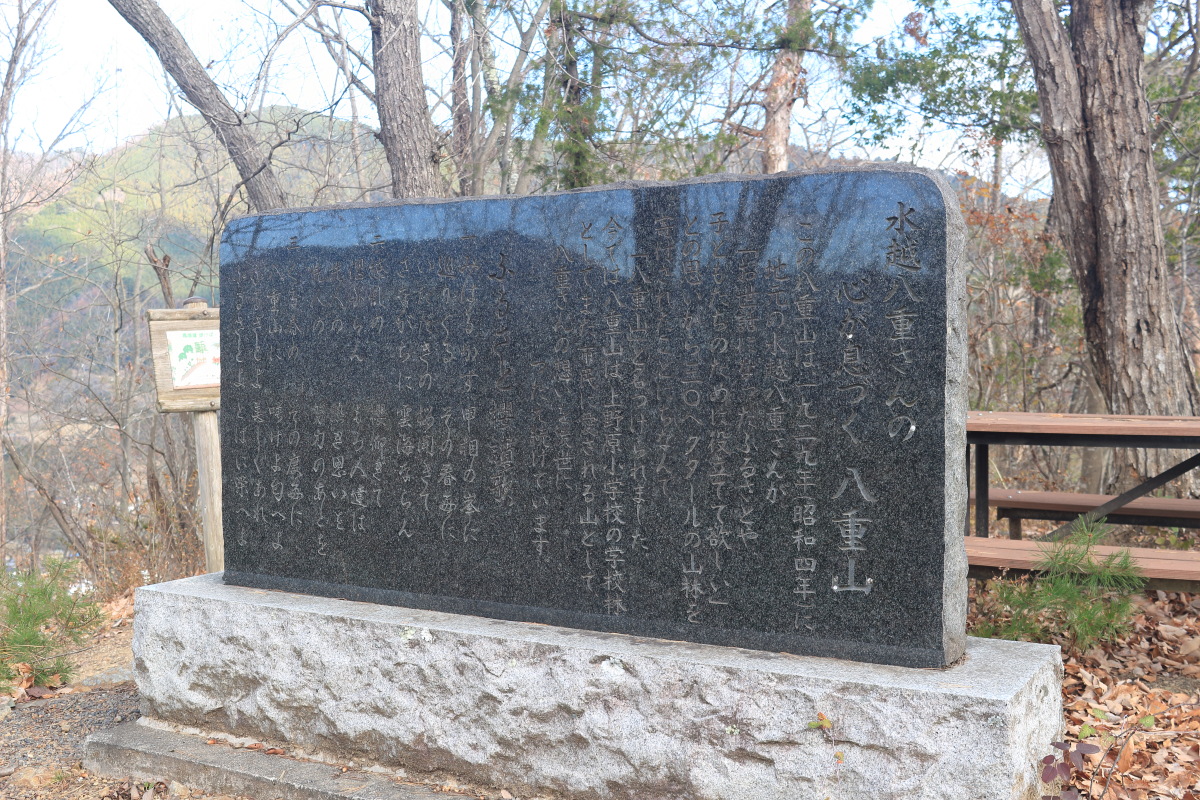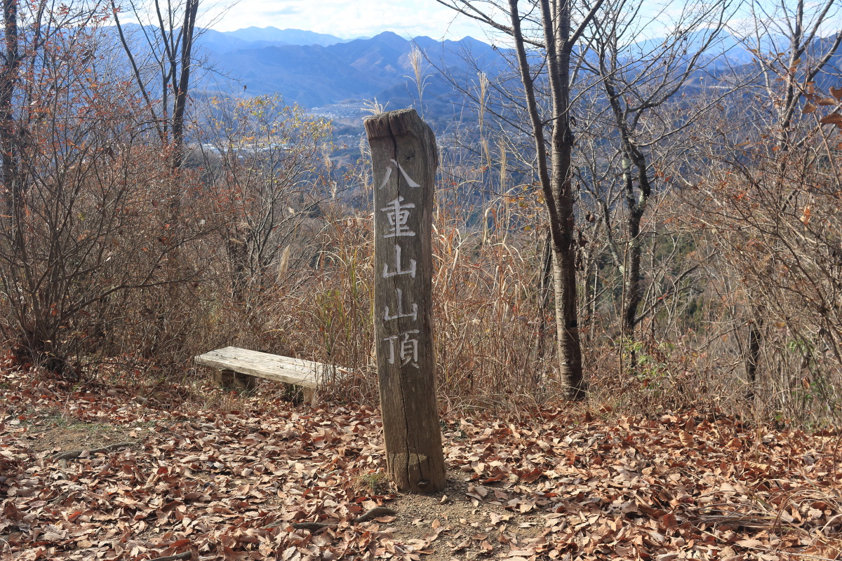 八重山(531m)到着(10:47)。山頂標はこちら。 Canon EOS Kiss X7 EF-S24mm f/2.8 STM 24mm(38mm) ISO 100 F7.1 1/200s |