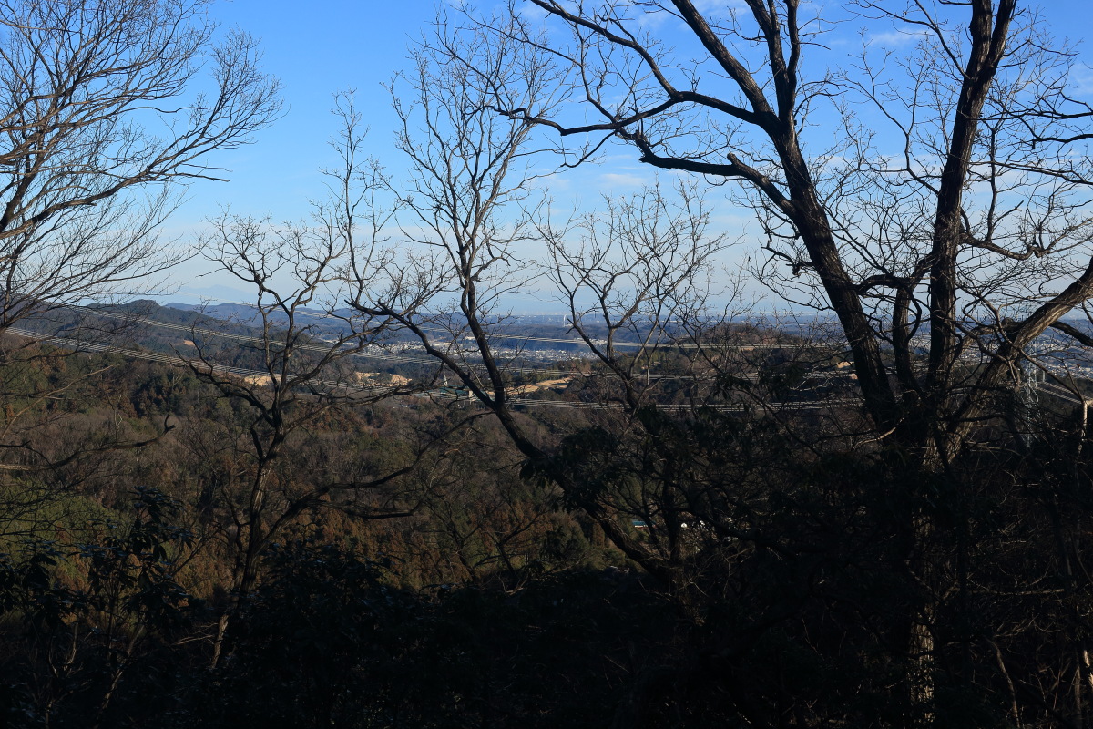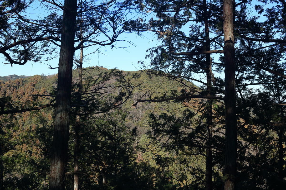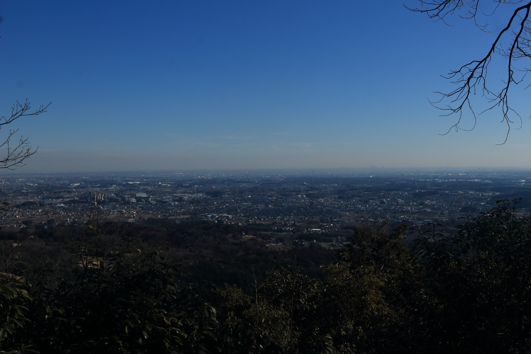 木の隙間から越生方面が見えました。 右側に、さっき登った石尊山が見えています。 Canon EOS Kiss X7 EF-S24mm f/2.8 STM 24mm(38mm) ISO 100 F8.0 1/250s |