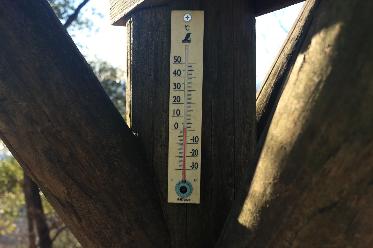 南北をつらぬる縦走路に合流しました(標高238m, 8:22)。 合流地点に温度計がありました。2℃です。 Canon EOS Kiss X7 EF-S24mm f/2.8 STM 24mm(38mm) ISO 100 F7.1 1/200s |