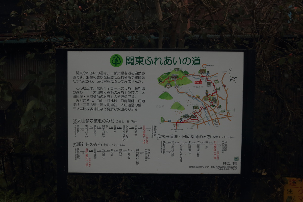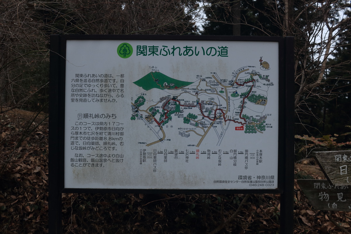 近くに関東ふれあいの道の説明板がありました。 関東ふれあいの道 「順礼峠、むじな坂峠がみどころ」って、そこには何もないような気がしましたが...。 Canon EOS Kiss X7 EF-S24mm f/2.8 STM 24mm(38mm) ISO 100 F5.6 1/80s |