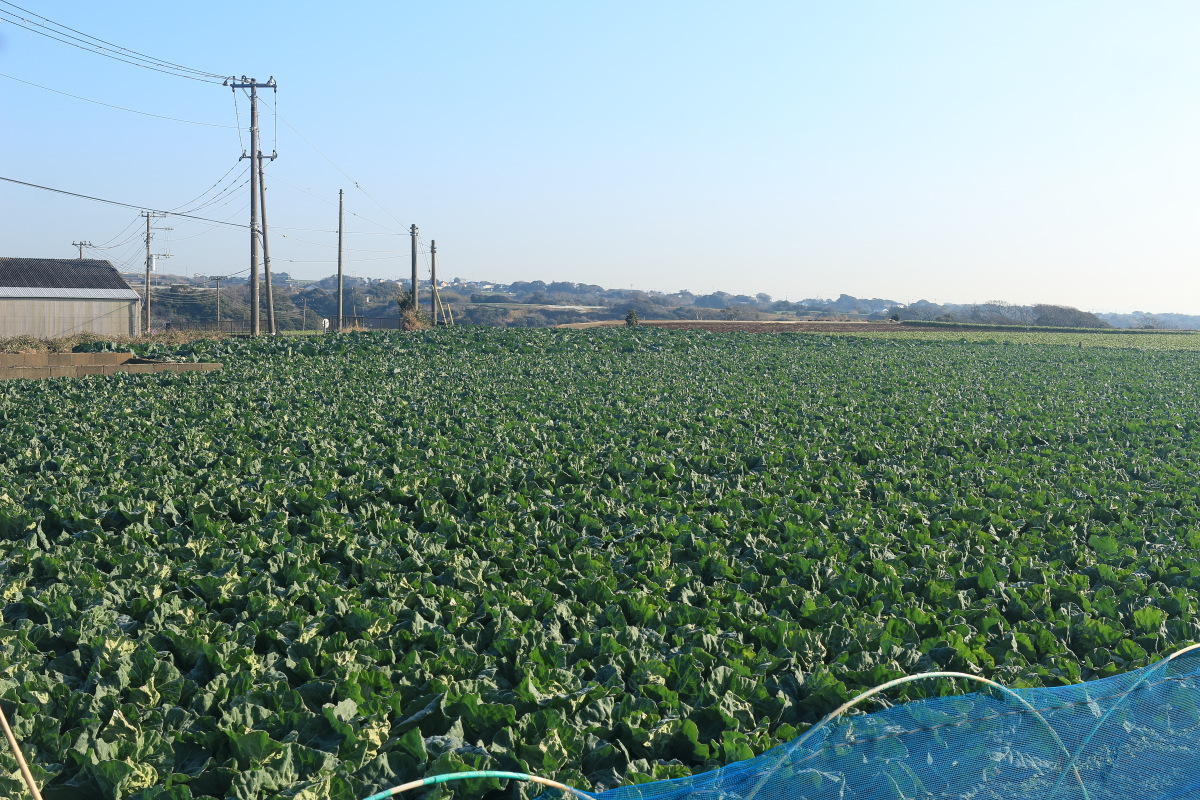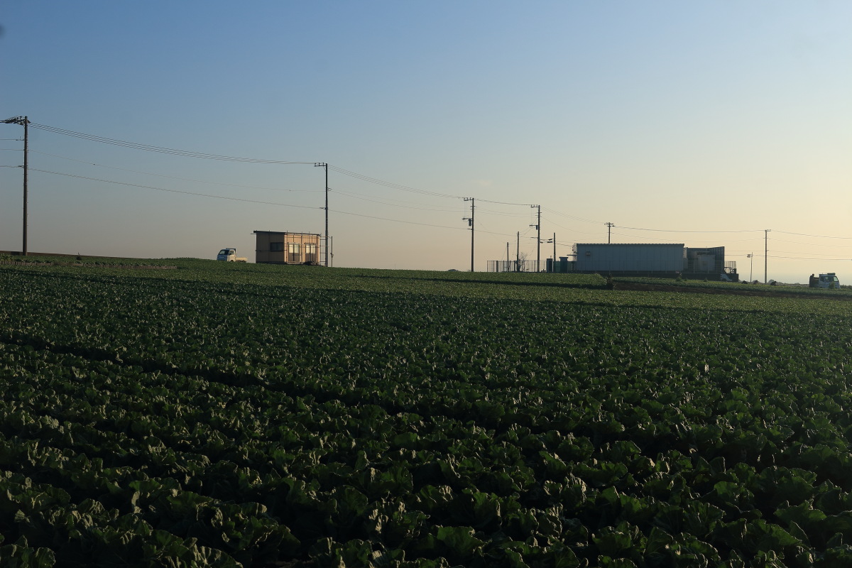 バスで松輪バス停に到着(7:32)。 バス停の前は、一面のキャベツ畑です。 Canon EOS Kiss X7 EF-S24mm f/2.8 STM 24mm(38mm) ISO 100 F9.0 1/320s |