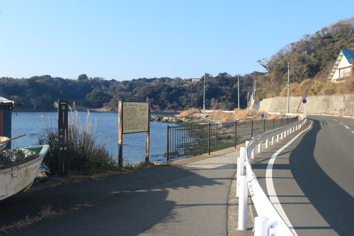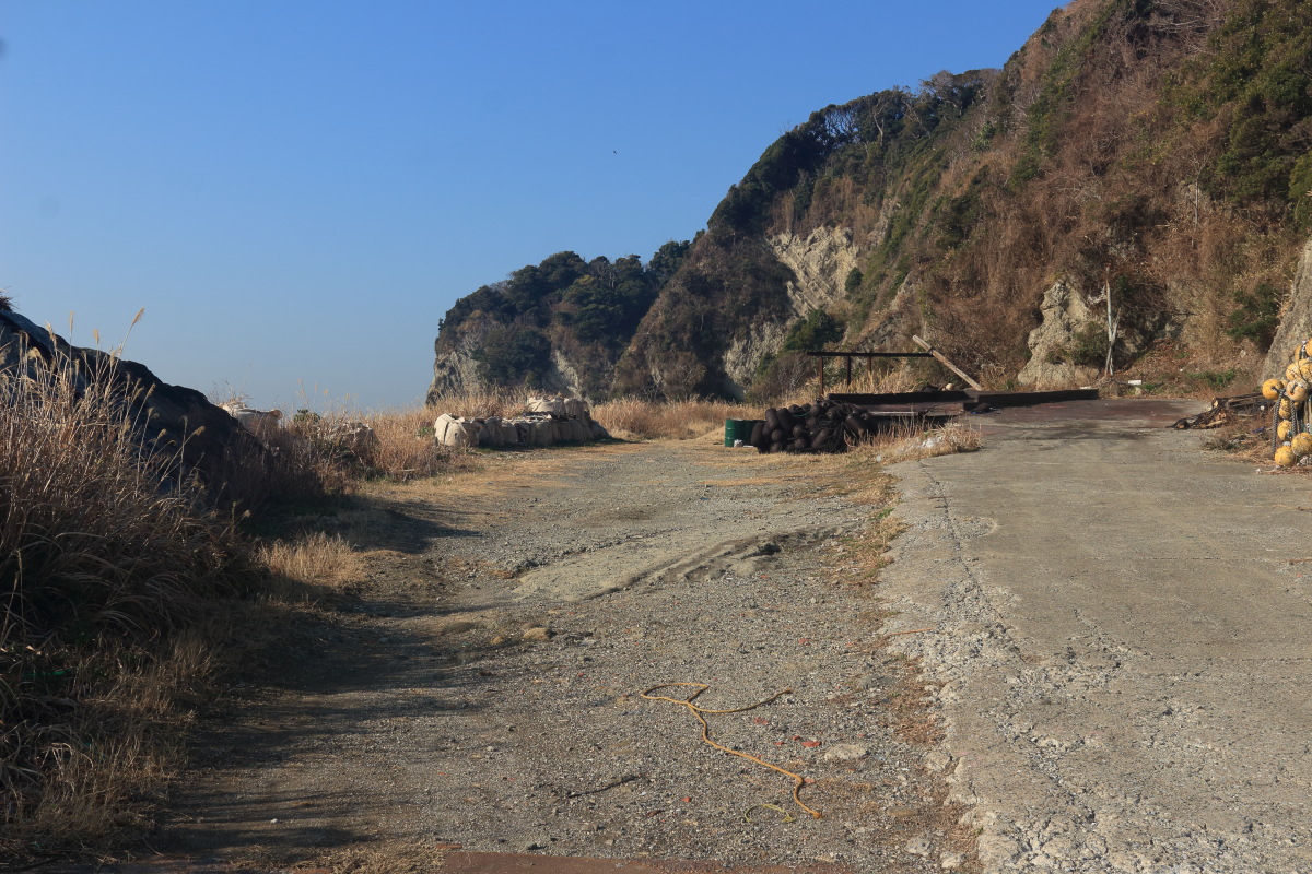 海岸歩きはいったん終了(9:02)。 毘沙門湾に沿って、再び車道歩きです。 Canon EOS Kiss X7 EF-S24mm f/2.8 STM 24mm(38mm) ISO 100 F10.0 1/400s |